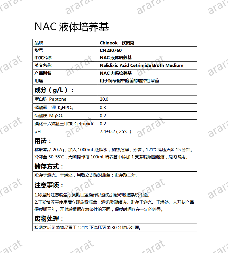 英文名称: Nalidixic Acid Cetrimide Broth Medium