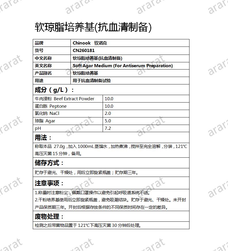 英文名称: Soft Agar Medium (For Antiserum Preparation)