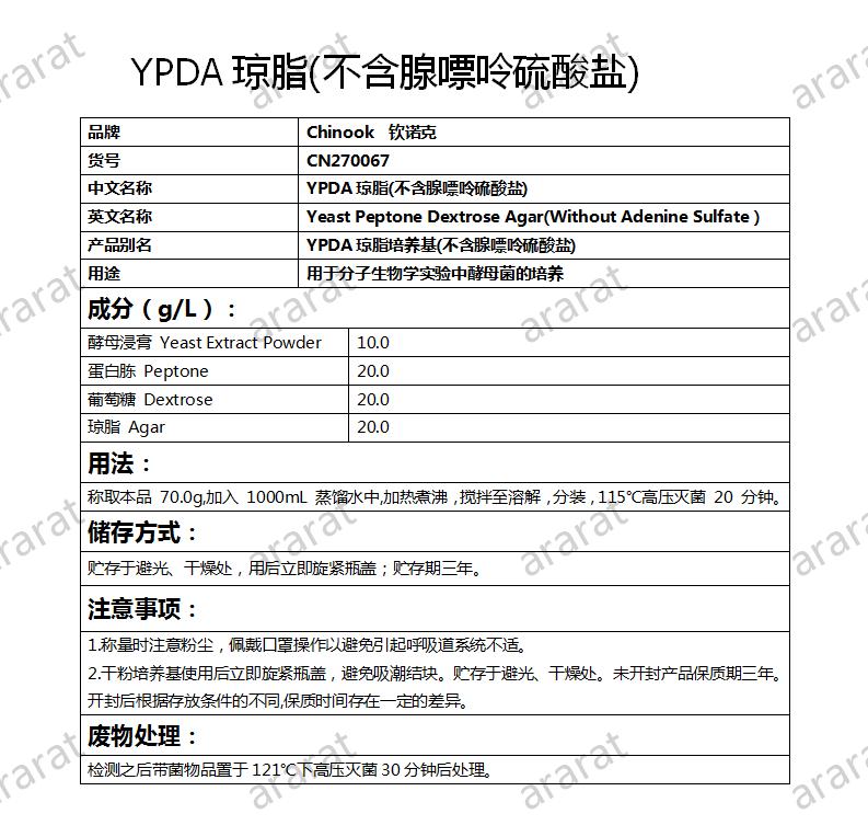 英文名称: Yeast Peptone Dextrose Agar(Without Adenine Sulfate )