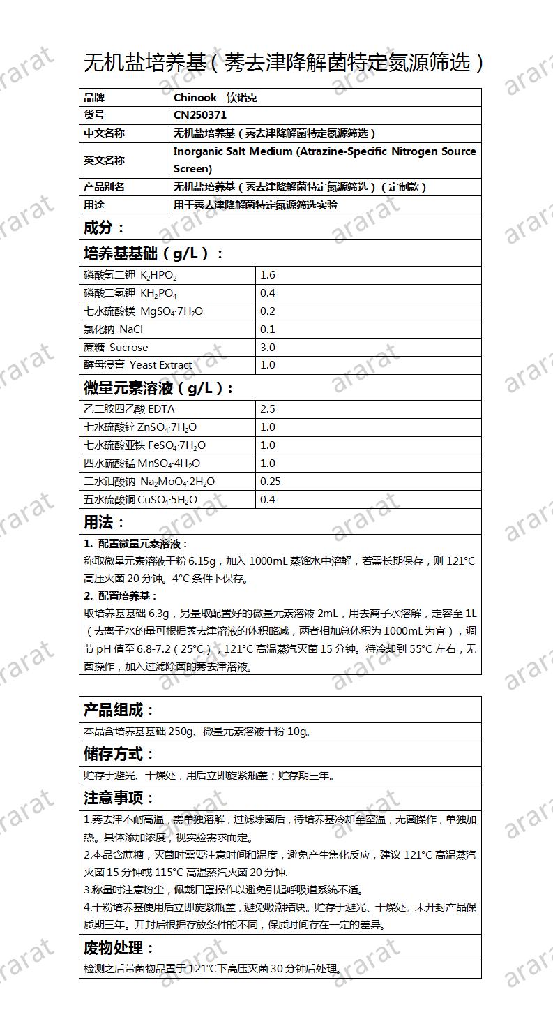 英文名称: Inorganic Salt Medium (Atrazine-Specific Nitrogen Source Screen)