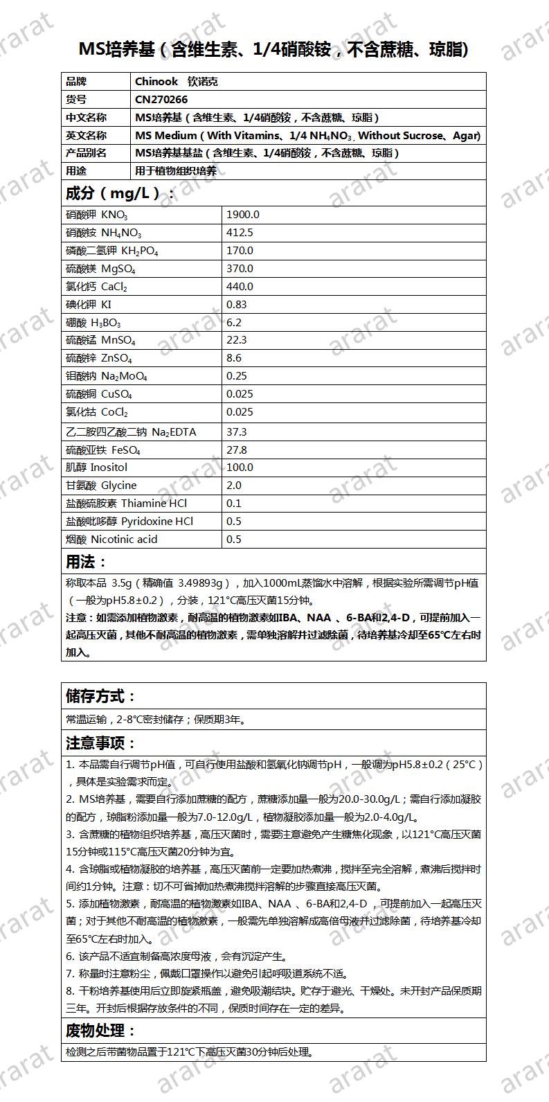 英文名称: MS Medium(With Vitamins、1/4 NH4NO3,Without Sucrose、Agar)