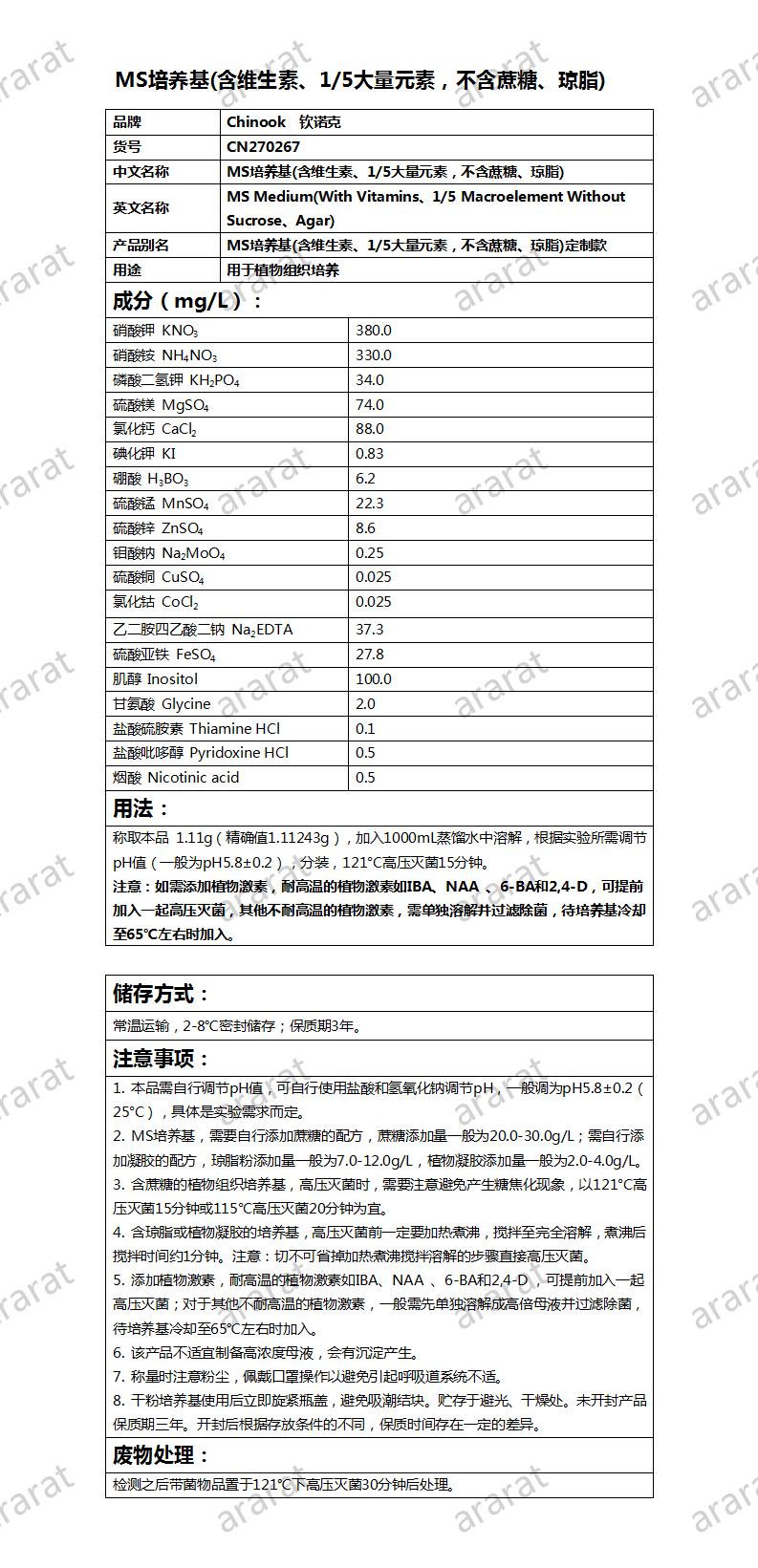 英文名称: MS Medium(With Vitamins、1/5 Macroelement Without Sucrose、Agar)
