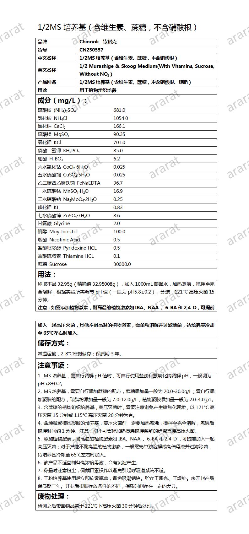 英文名称: 1/2 Murashige & Skoog Medium(With Vitamins, Sucrose, Without NO3-)