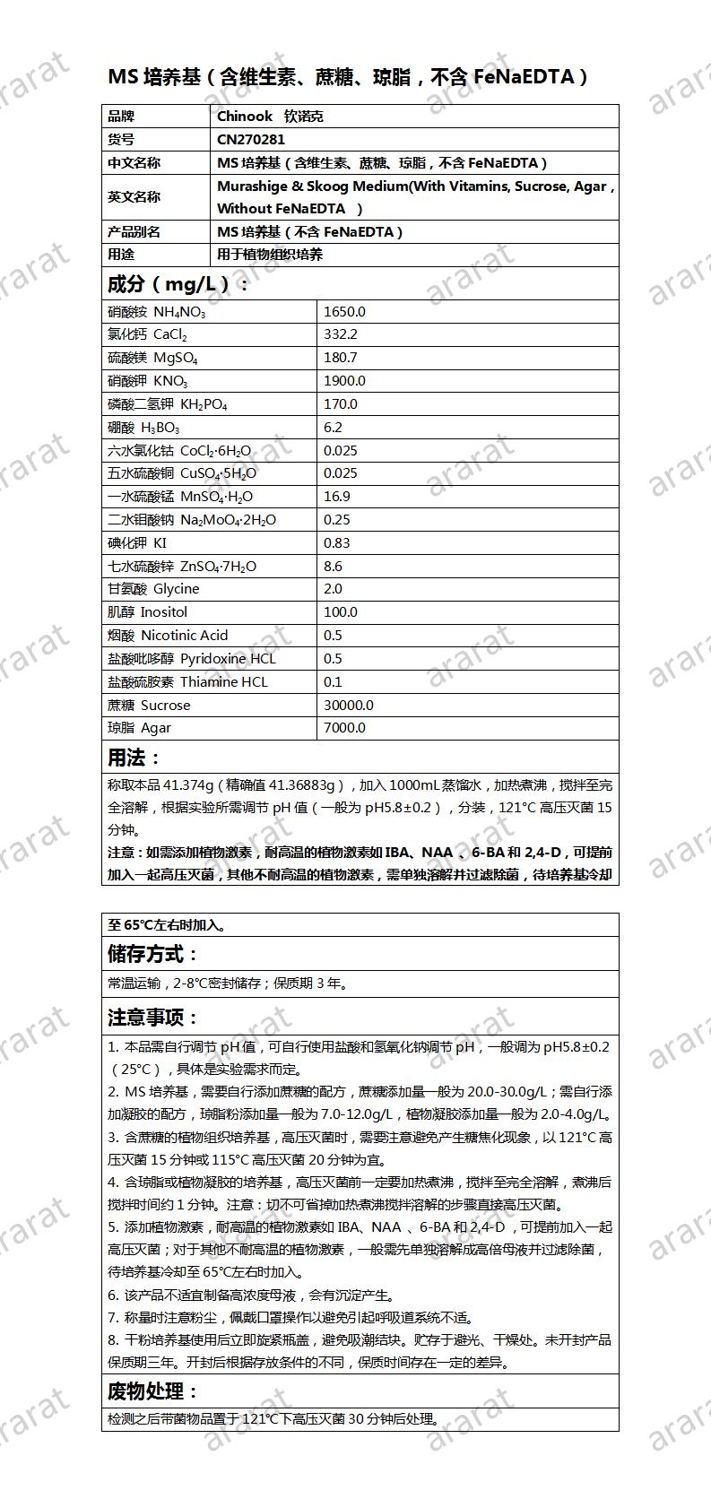 英文名称: Murashige & Skoog Medium(With Vitamins, Sucrose, Agar,Without FeNaEDTA )