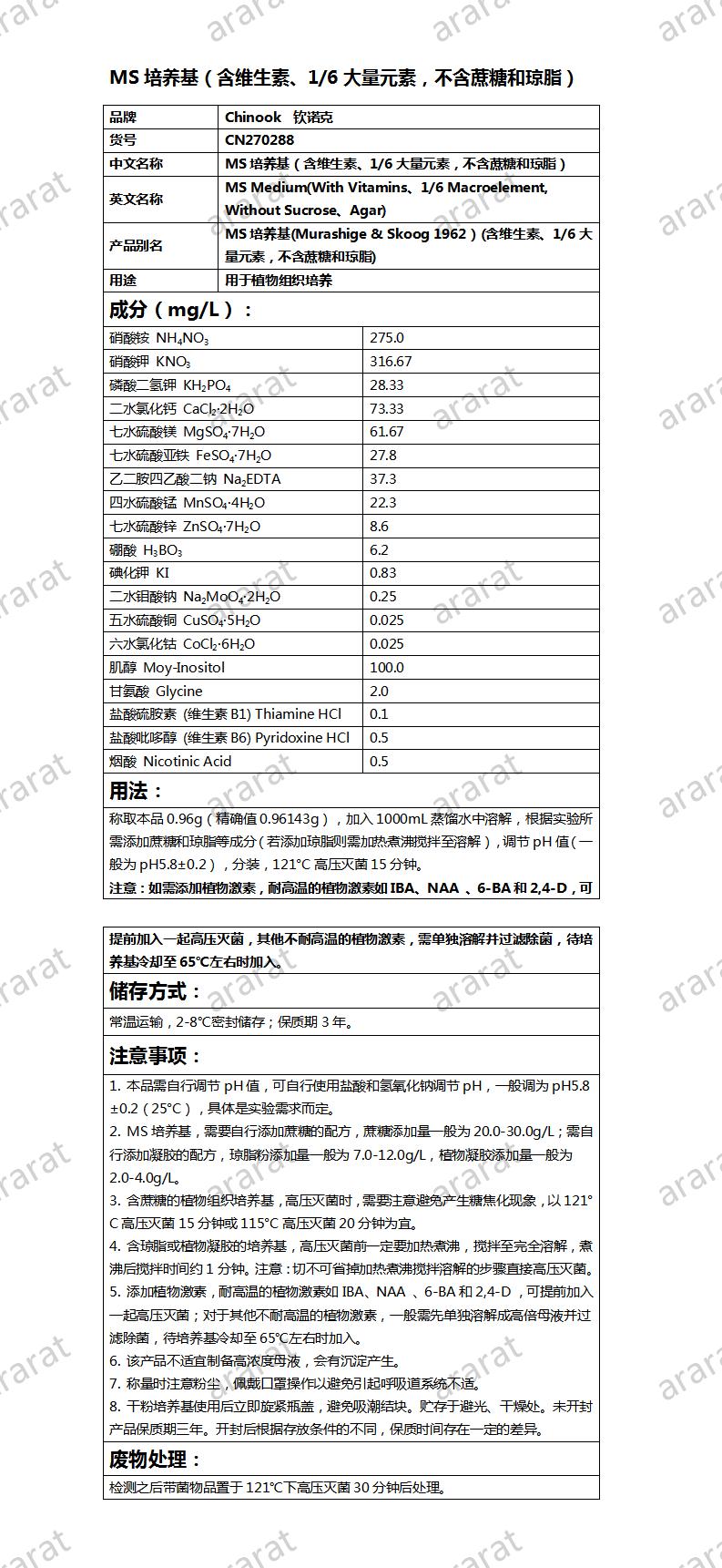 英文名称: MS Medium(With Vitamins、1/6 Macroelement, Without Sucrose、Agar)