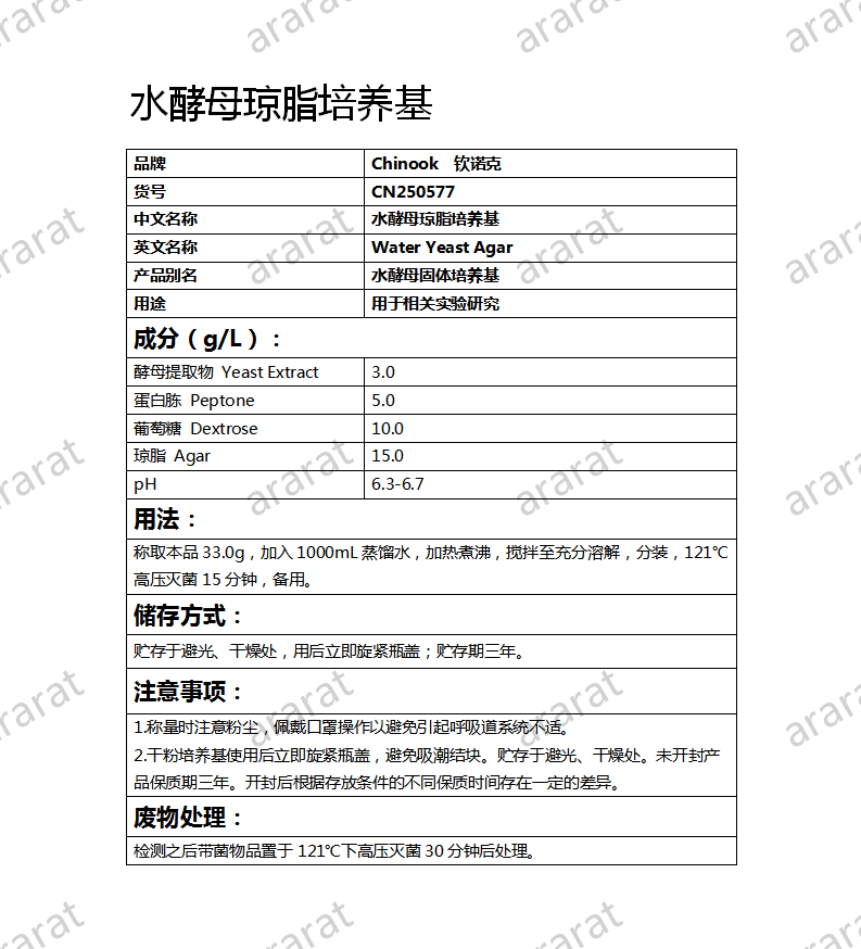 英文名称: Water Yeast Agar
