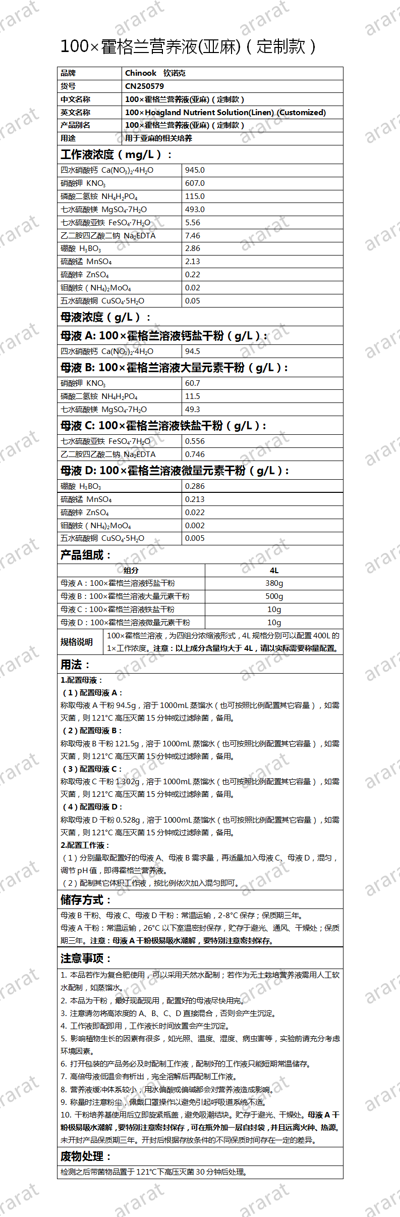 英文名称: 100×Hoagland Nutrient Solution(Linen) (Customized)