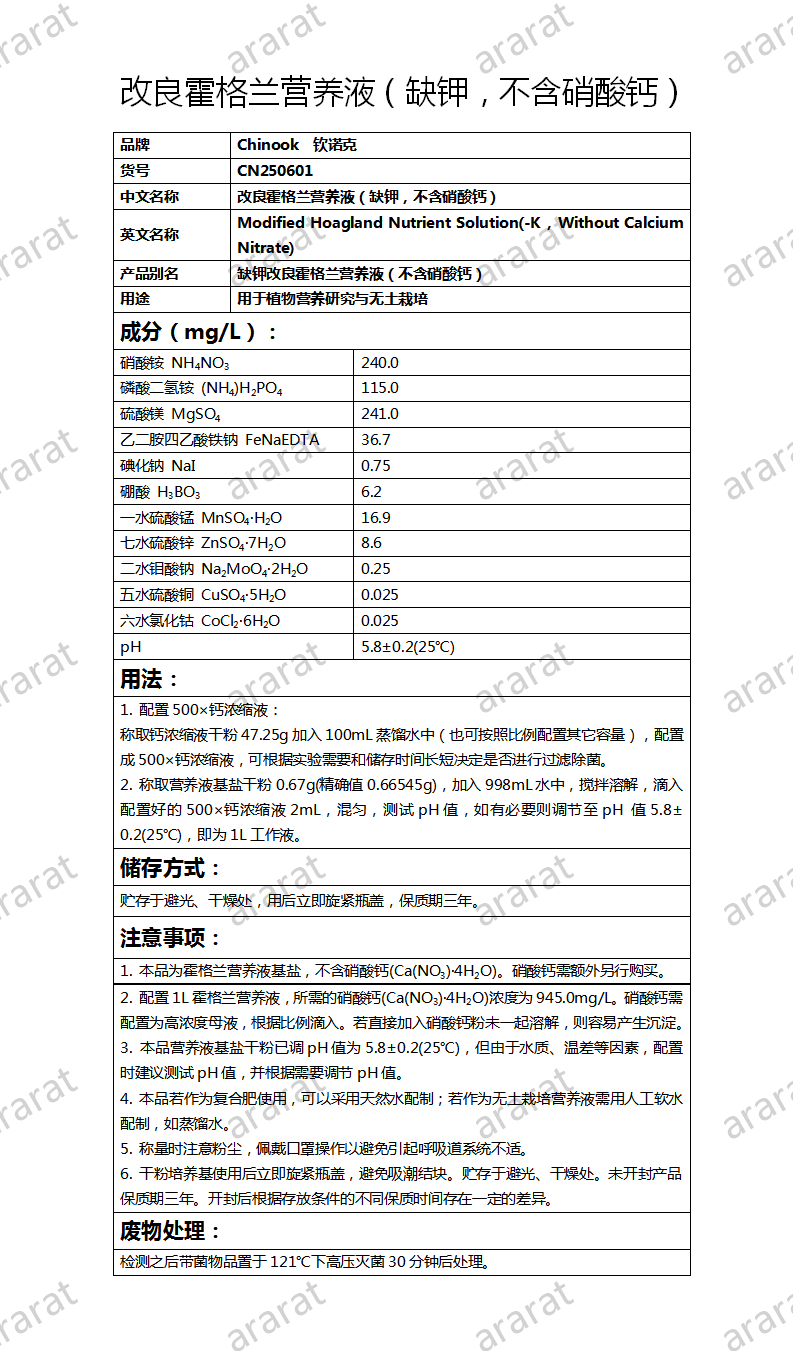 英文名称: Modified Hoagland Nutrient Solution(-K,Without Calcium Nitrate)